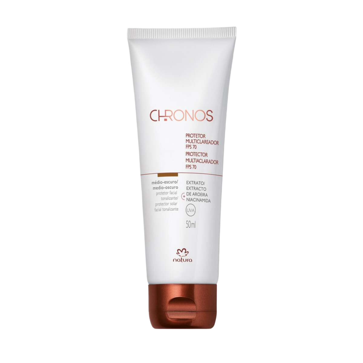AA linha Chronos da Natura é focada em cuidados avançados para a pele do rosto, combinando proteção solar com benefícios antienvelhecimento.